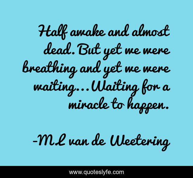 This page presents the quote "Half awake and almost dead. But yet we were breathing and yet we were waiting...Waiting for a miracle to happen.". Author of this quote is M.L van de Weetering. This quote is about life, dead, fitting, miracle, awakened, life-and-death,.