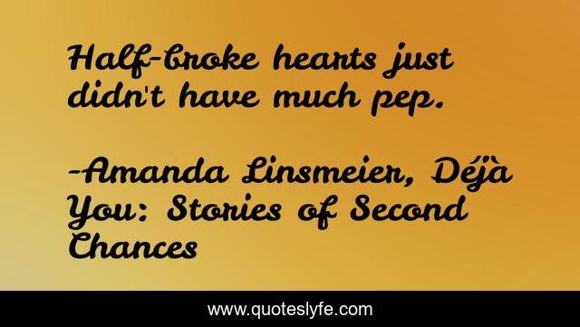 This page presents the quote "Half-broke hearts just didn't have much pep.". Author of this quote is Amanda Linsmeier, Déjà You: Stories of Second Chances. This quote is about broken-heart, grief, love, affection, hearts,.