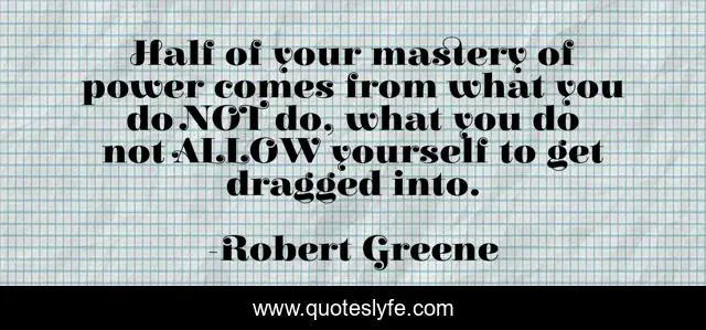 This page presents the quote "Half of your mastery of power comes from what you do NOT do, what you do not ALLOW yourself to get dragged into.". Author of this quote is Robert Greene. This quote is about power, realist,.