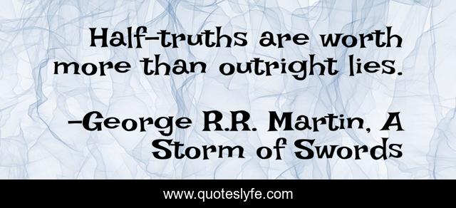 This page presents the quote "Half-truths are worth more than outright lies.". Author of this quote is George R.R. Martin, A Storm of Swords. This quote is about lie, deception, truth,.