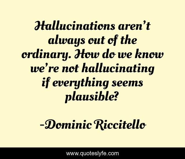 This page presents the quote "Hallucinations aren’t always out of the ordinary. How do we know we’re not hallucinating if everything seems plausible?". Author of this quote is Dominic Riccitello. This quote is about life, normal, strange, perspective, truth, hallucinations, ordinary, thoughts,.