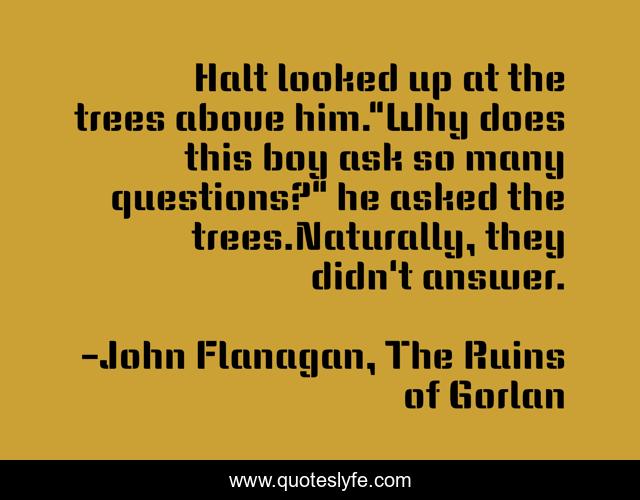 This page presents the quote "Halt looked up at the trees above him."Why does this boy ask so many questions?" he asked the trees.Naturally, they didn't answer.". Author of this quote is John Flanagan, The Ruins of Gorlan. This quote is about rangers, halt, questions,.