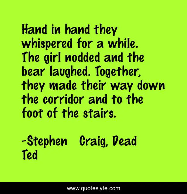 This page presents the quote "Hand in hand they whispered for a while. The girl nodded and the bear laughed. Together, they made their way down the corridor and to the foot of the stairs.". Author of this quote is Stephen Craig, Dead Ted. This quote is about girl, short, bear,.
