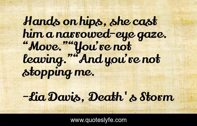 This page presents the quote "Hands on hips, she cast him a narrowed-eye gaze. “Move.”“You’re not leaving.”“And you’re not stopping me.". Author of this quote is Lia Davis, Death's Storm. This quote is about witch, demon, magic, paranormal-romance, death-s-storm,.