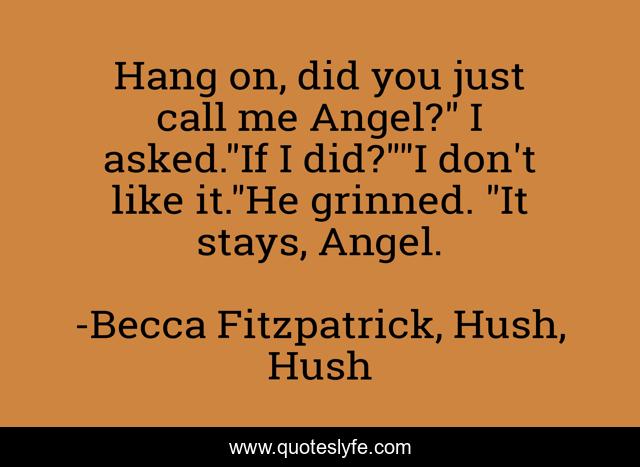 This page presents the quote "Hang on, did you just call me Angel?" I asked."If I did?""I don't like it."He grinned. "It stays, Angel.". Author of this quote is Becca Fitzpatrick, Hush, Hush. This quote is about hush, nora-grey, becca-fitzpatrick, angel, patch,.