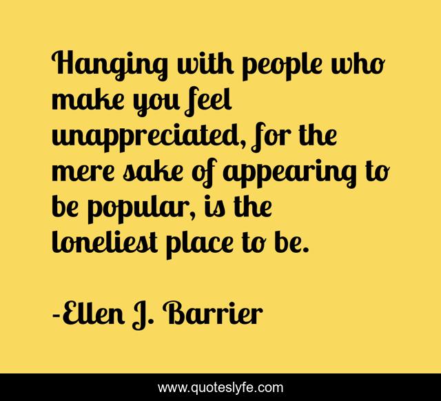 This page presents the quote "Hanging with people who make you feel unappreciated, for the mere sake of appearing to be popular, is the loneliest place to be.". Author of this quote is Ellen J. Barrier. This quote is about unappreciated, lonely, crowd, people, feel, loneliest, popularity, feelings, popular,.
