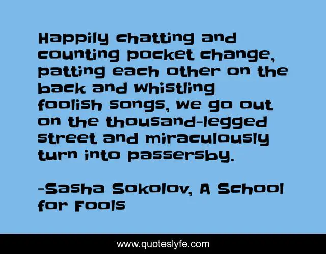This page presents the quote "Happily chatting and counting pocket change, patting each other on the back and whistling foolish songs, we go out on the thousand-legged street and miraculously turn into passersby.". Author of this quote is Sasha Sokolov, A School for Fools. .