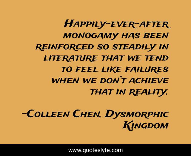 This page presents the quote "Happily-ever-after monogamy has been reinforced so steadily in literature that we tend to feel like failures when we don’t achieve that in reality.". Author of this quote is Colleen Chen, Dysmorphic Kingdom. This quote is about literature, love, fantasy, reality, culture, society, monogamy, affection, happily-ever-after,.