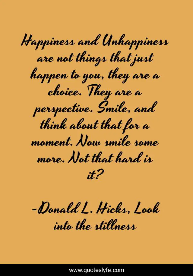 This page presents the quote "Happiness and Unhappiness are not things that just happen to you, they are a choice. They are a perspective. Smile, and think about that for a moment. Now smile some more. Not that hard is it?". Author of this quote is Donald L. Hicks, Look into the stillness. This quote is about smile, perspective, happiness, unhappiness,.