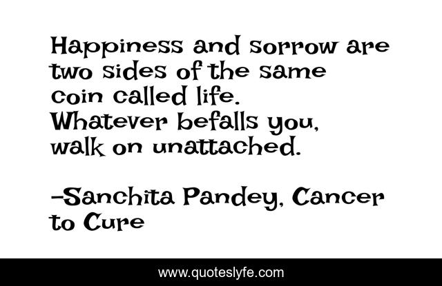 This page presents the quote "Happiness and sorrow are two sides of the same coin called life. Whatever befalls you, walk on unattached.". Author of this quote is Sanchita Pandey, Cancer to Cure. This quote is about go-on, sorrow, cancer-survivor, happiness-advice, life-philosophy,.