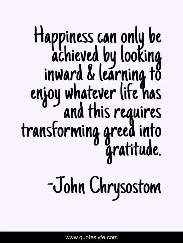 This page presents the quote "Happiness can only be achieved by looking inward & learning to enjoy whatever life has and this requires transforming greed into gratitude.". Author of this quote is John Chrysostom. This quote is about contentment, happiness, inner-peace,.
