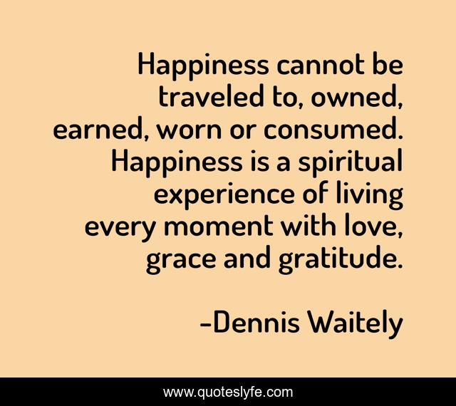 This page presents the quote "Happiness cannot be traveled to, owned, earned, worn or consumed. Happiness is a spiritual experience of living every moment with love, grace and gratitude.". Author of this quote is Dennis Waitely. This quote is about inspirational-attitude, happiness,.
