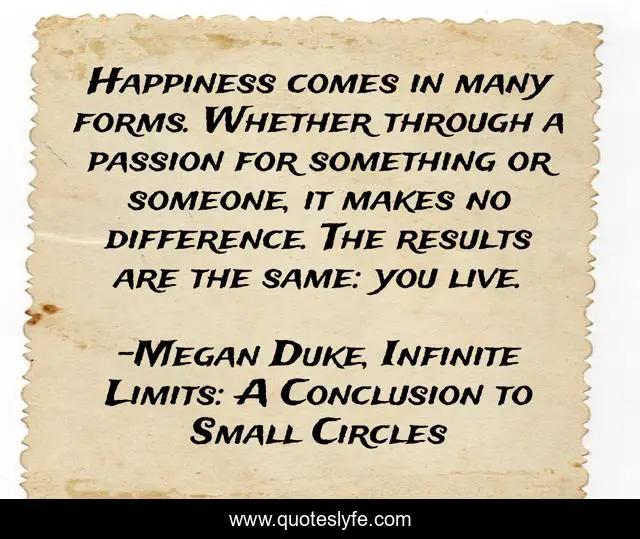 "Megan Duke, Infinite Limits: A Conclusion to Small Circles Quotes." Quoteslyfe.com, 2025. Fri. 05 Dec. 2025. <https://www.quoteslyfe.com/quote/Happiness-comes-in-many-forms-Whether-through-245069>.