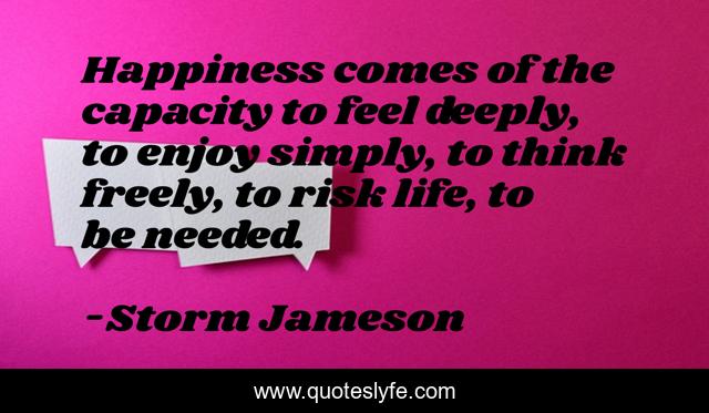 This page presents the quote "Happiness comes of the capacity to feel deeply, to enjoy simply, to think freely, to risk life, to be needed.". Author of this quote is Storm Jameson. This quote is about enjoy, life, risk,.