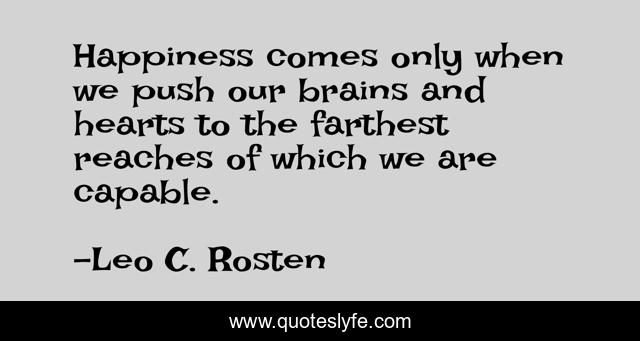 This page presents the quote "Happiness comes only when we push our brains and hearts to the farthest reaches of which we are capable.". Author of this quote is Leo C. Rosten. .