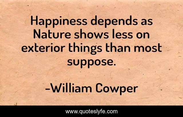 "William Cowper Quotes." Quoteslyfe.com, 2025. Sat. 06 Dec. 2025. <https://www.quoteslyfe.com/quote/Happiness-depends-as-Nature-shows-less-on-267609>.