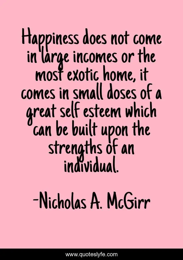 This page presents the quote "Happiness does not come in large incomes or the most exotic home, it comes in small doses of a great self esteem which can be built upon the strengths of an individual.". Author of this quote is Nicholas A. McGirr. This quote is about enthusiasm, strength, inspirational, self-esteem,.