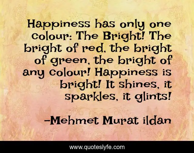 This page presents the quote "Happiness has only one colour: The Bright! The bright of red, the bright of green, the bright of any colour! Happiness is bright! It shines, it sparkles, it glints!". Author of this quote is Mehmet Murat ildan. This quote is about shine, colours, mehmet-murat-ildan, ildan-wise-sayings, turkish, ildan-wisdom, turkish-playwrights, bright, turkish-wisdom-words,.