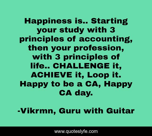 This page presents the quote "Happiness is.. Starting your study with 3 principles of accounting, then your profession, with 3 principles of life.. CHALLENGE it, ACHIEVE it, Loop it. Happy to be a CA, Happy CA day.". Author of this quote is Vikrmn, Guru with Guitar. This quote is about gwg, vikram, career, positive, study, motivational, profession, confidence, ca-vikram-verma,.