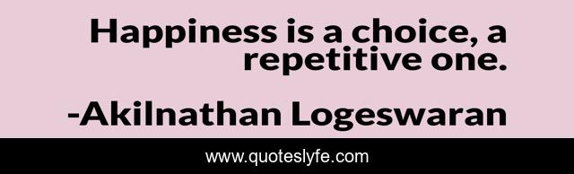 This page presents the quote "Happiness is a choice, a repetitive one.". Author of this quote is Akilnathan Logeswaran. This quote is about happiness-choices, happy-soul, choice, happy-life, happiness-advice, bliss, happiness, happy,.