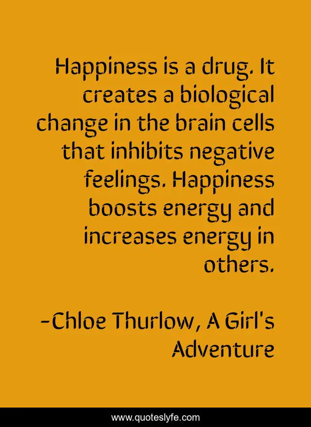 This page presents the quote "Happiness is a drug. It creates a biological change in the brain cells that inhibits negative feelings. Happiness boosts energy and increases energy in others.". Author of this quote is Chloe Thurlow, A Girl's Adventure. This quote is about energy, happiness,.