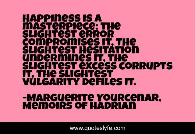 This page presents the quote "Happiness is a masterpiece: the slightest error compromises it, the slightest hesitation undermines it, the slightest excess corrupts it, the slightest vulgarity defiles it.". Author of this quote is Marguerite Yourcenar, Memoirs of Hadrian. .