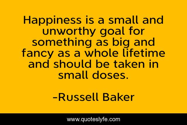 This page presents the quote "Happiness is a small and unworthy goal for something as big and fancy as a whole lifetime and should be taken in small doses.". Author of this quote is Russell Baker. .