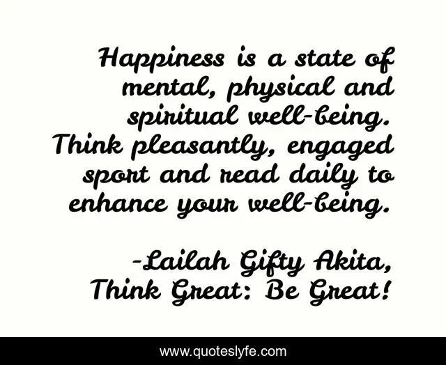 "Lailah Gifty Akita, Think Great: Be Great! Quotes." Quoteslyfe.com, 2025. Mon. 08 Dec. 2025. <https://www.quoteslyfe.com/quote/Happiness-is-a-state-of-mental-physical-121306>.