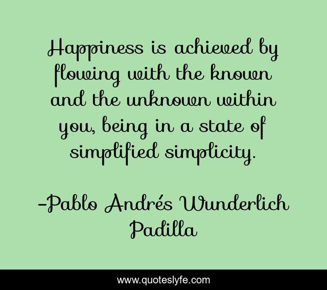This page presents the quote "Happiness is achieved by flowing with the known and the unknown within you, being in a state of simplified simplicity.". Author of this quote is Pablo Andrés Wunderlich Padilla. This quote is about simple, flow, true, happiness,.