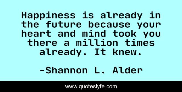 This page presents the quote "Happiness is already in the future because your heart and mind took you there a million times already. It knew.". Author of this quote is Shannon L. Alder. This quote is about faith, future, happiness,.