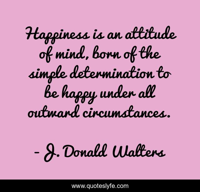 This page presents the quote "Happiness is an attitude of mind, born of the simple determination to be happy under all outward circumstances.". Author of this quote is J. Donald Walters. This quote is about happiness, happy,.