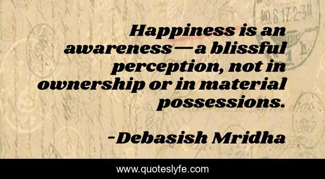 This page presents the quote "Happiness is an awareness—a blissful perception, not in ownership or in material possessions.". Author of this quote is Debasish Mridha. This quote is about what-is-happiness, blissful-perception, philosophy, debasish-mridha, quotes, inspirational, enthusiasm, debasish-mridha-m-d, happiness,.