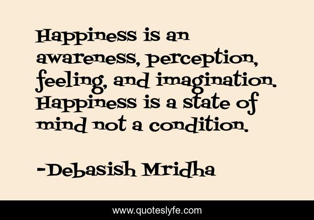 This page presents the quote "Happiness is an awareness, perception, feeling, and imagination. Happiness is a state of mind not a condition.". Author of this quote is Debasish Mridha. This quote is about life, perception, love, knowledge, inspirational, intelligence, philosophy, mind, affection,.