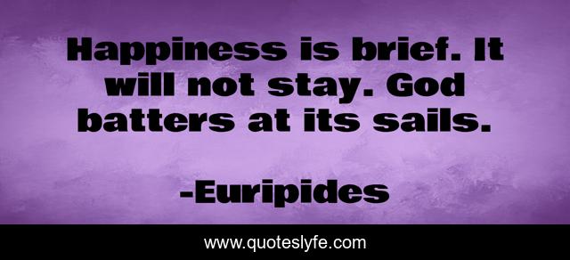 This page presents the quote "Happiness is brief. It will not stay. God batters at its sails.". Author of this quote is Euripides. This quote is about god, sails,.