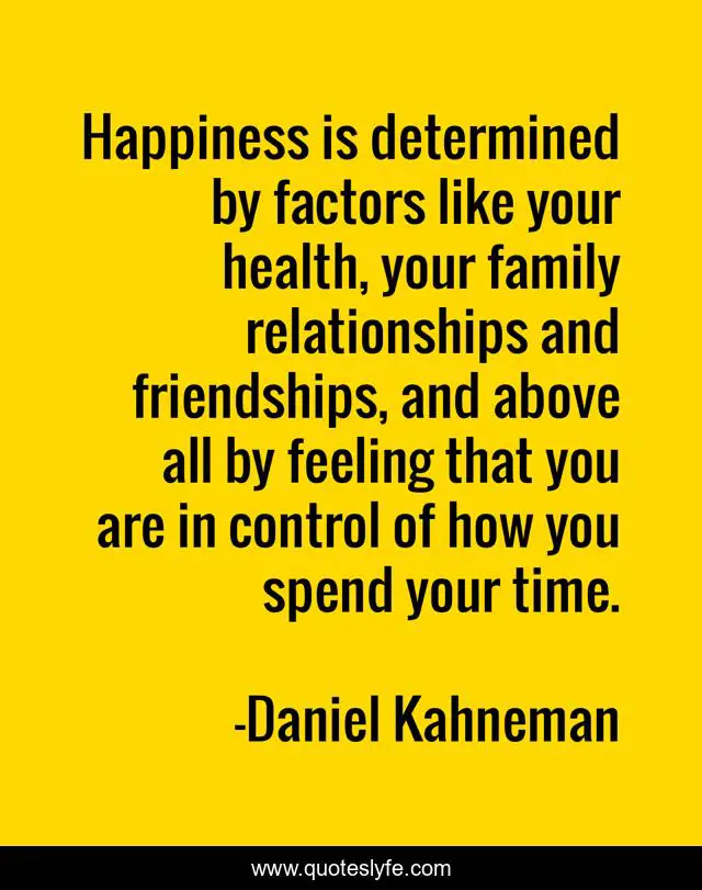 This page presents the quote "Happiness is determined by factors like your health, your family relationships and friendships, and above all by feeling that you are in control of how you spend your time.". Author of this quote is Daniel Kahneman. This quote is about health, family, time,.