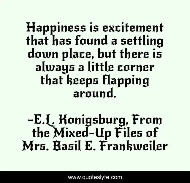 This page presents the quote "Happiness is excitement that has found a settling down place, but there is always a little corner that keeps flapping around.". Author of this quote is E.L. Konigsburg, From the Mixed-Up Files of Mrs. Basil E. Frankweiler. .