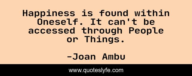 This page presents the quote "Happiness is found within Oneself. It can't be accessed through People or Things.". Author of this quote is Joan Ambu. This quote is about self-love, contentment, happiness,.