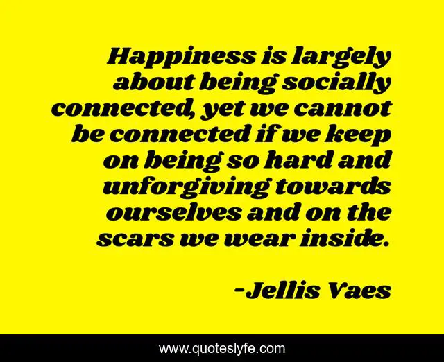 This page presents the quote "Happiness is largely about being socially connected, yet we cannot be connected if we keep on being so hard and unforgiving towards ourselves and on the scars we wear inside.". Author of this quote is Jellis Vaes. This quote is about jellis-vaes, scars, connection, courage, inner-picture-stories, humanity, happiness,.