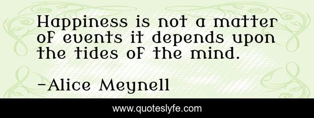 This page presents the quote "Happiness is not a matter of events it depends upon the tides of the mind.". Author of this quote is Alice Meynell. .