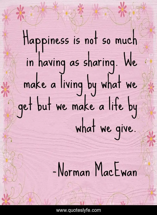 This page presents the quote "Happiness is not so much in having as sharing. We make a living by what we get but we make a life by what we give.". Author of this quote is Norman MacEwan. .
