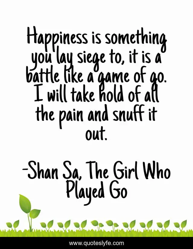 This page presents the quote "Happiness is something you lay siege to, it is a battle like a game of go. I will take hold of all the pain and snuff it out.". Author of this quote is Shan Sa, The Girl Who Played Go. This quote is about go, happiness,.