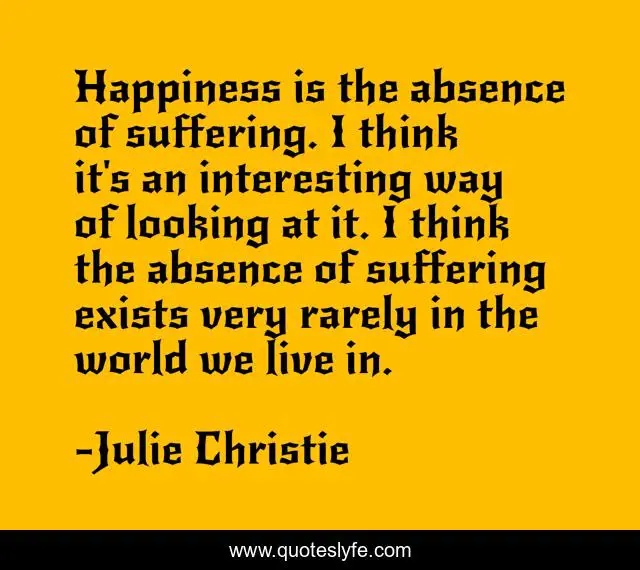 This page presents the quote "Happiness is the absence of suffering. I think it's an interesting way of looking at it. I think the absence of suffering exists very rarely in the world we live in.". Author of this quote is Julie Christie. This quote is about looking, world, suffering,.