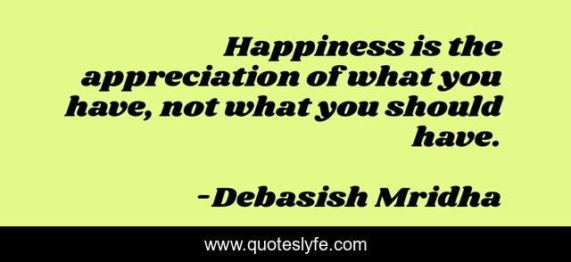 This page presents the quote "Happiness is the appreciation of what you have, not what you should have.". Author of this quote is Debasish Mridha. This quote is about life, debasish, mridha, philosophy, appreciation, happiness,.