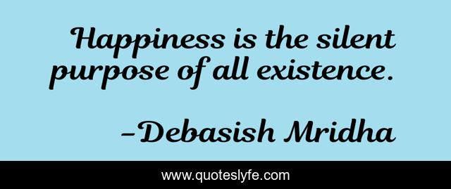 This page presents the quote "Happiness is the silent purpose of all existence.". Author of this quote is Debasish Mridha. This quote is about all-existence, silent-purpose, mridha, philosophy, debasish-mridha, debasish, happiness,.