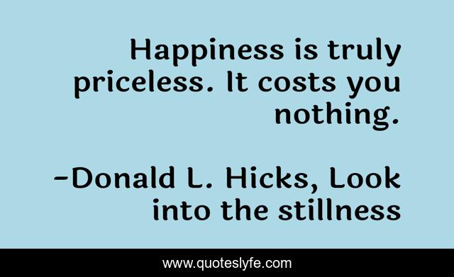 This page presents the quote "Happiness is truly priceless. It costs you nothing.". Author of this quote is Donald L. Hicks, Look into the stillness. This quote is about priceless, happiness, happy,.