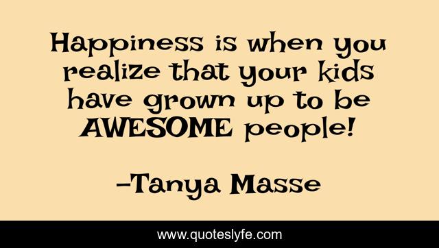 This page presents the quote "Happiness is when you realize that your kids have grown up to be AWESOME people!". Author of this quote is Tanya Masse. This quote is about parenthood, motherhood, quotes-about-kids,.