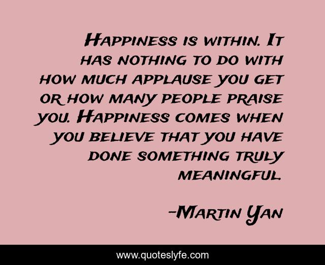 This page presents the quote "Happiness is within. It has nothing to do with how much applause you get or how many people praise you. Happiness comes when you believe that you have done something truly meaningful.". Author of this quote is Martin Yan. This quote is about believe, meaningful, people,.