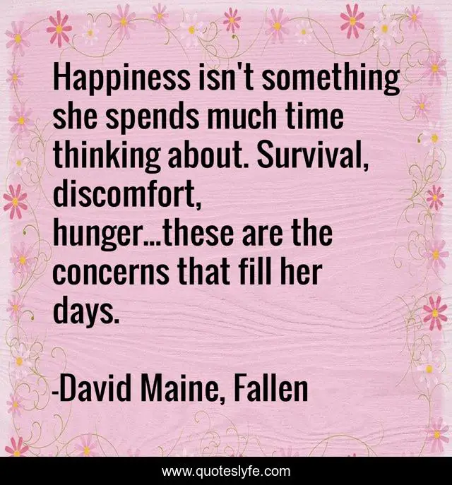 This page presents the quote "Happiness isn't something she spends much time thinking about. Survival, discomfort, hunger...these are the concerns that fill her days.". Author of this quote is David Maine, Fallen. This quote is about existence, biblical, desperation,.