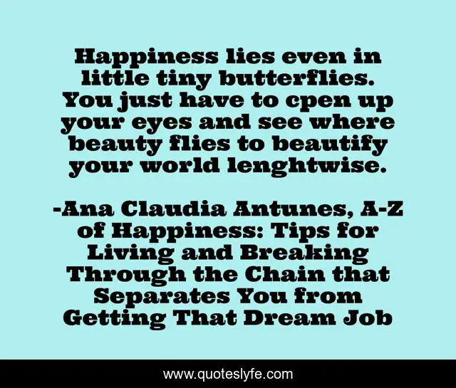 "Ana Claudia Antunes, A-Z of Happiness: Tips for Living and Breaking Through the Chain that Separates You from Getting That Dream Job Quotes." Quoteslyfe.com, 2025. Mon. 08 Dec. 2025. <https://www.quoteslyfe.com/quote/Happiness-lies-even-in-little-tiny-butterflies-61248>.