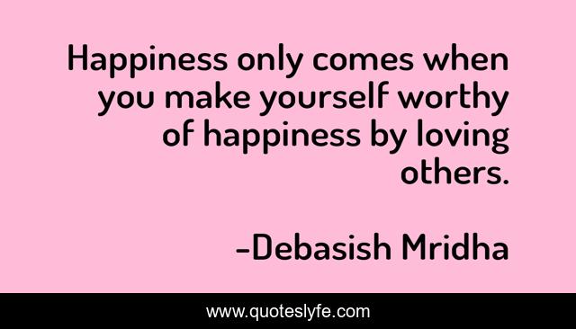 This page presents the quote "Happiness only comes when you make yourself worthy of happiness by loving others.". Author of this quote is Debasish Mridha. This quote is about philosophy, debasish-mridha, how-to-be-happy, quotes, loving-others, inspirational, enthusiasm, debasish-mridha-m-d, happiness,.